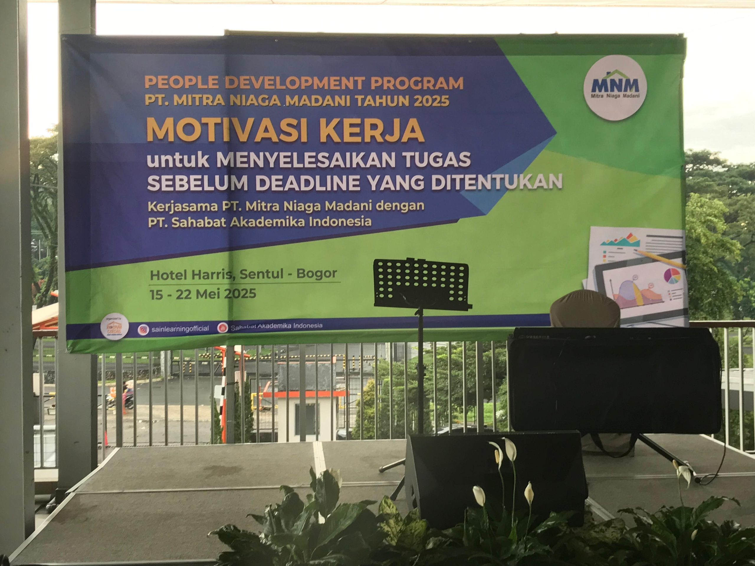Acara Training People Development Program hasil kerja sama antara PT Mitra Niaga Madani dan PT Sahabat Akademika Indonesia berlangsung sukses dari tanggal 15 hingga 22 Mei 2025 di Hotel Harris Sentul, Bogor. Kegiatan ini merupakan bagian dari program pengembangan sumber daya manusia (SDM) yang bertujuan meningkatkan kompetensi dan kualitas kerja para peserta dari berbagai latar belakang profesional.